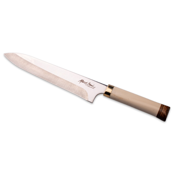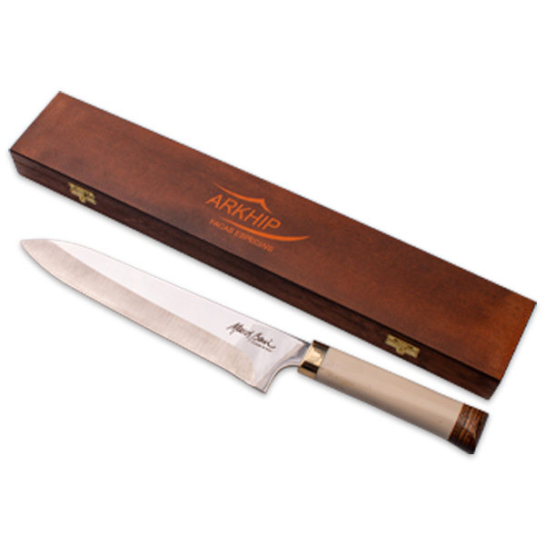 A Chef Plus Osso é uma faca para churrasco, artesanal, feita em aço inox, lâmina de 10 polegadas, cabo de osso de avestruz e estojo de madeira.