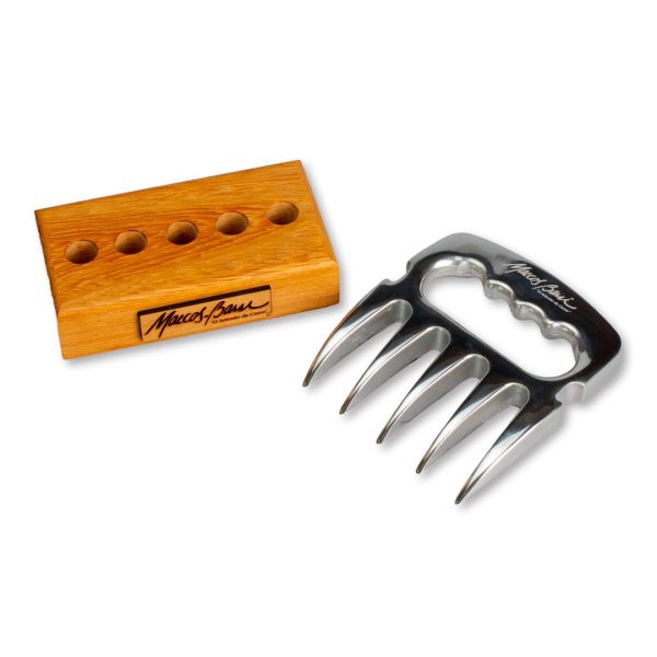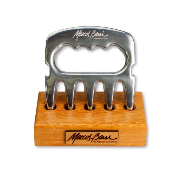 A garra de urso é um acessório fabricado em inox que auxilia o assador na retirada da carne do espeto, no corte em geral e para desfiar a carne.