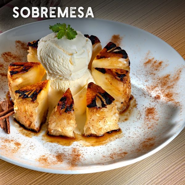 Abacaxi grelhado, salpicado com canela e açúcar, formando uma deliciosa calda caramelizada e sorvete de creme.