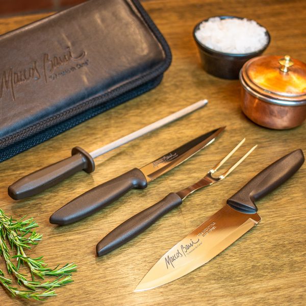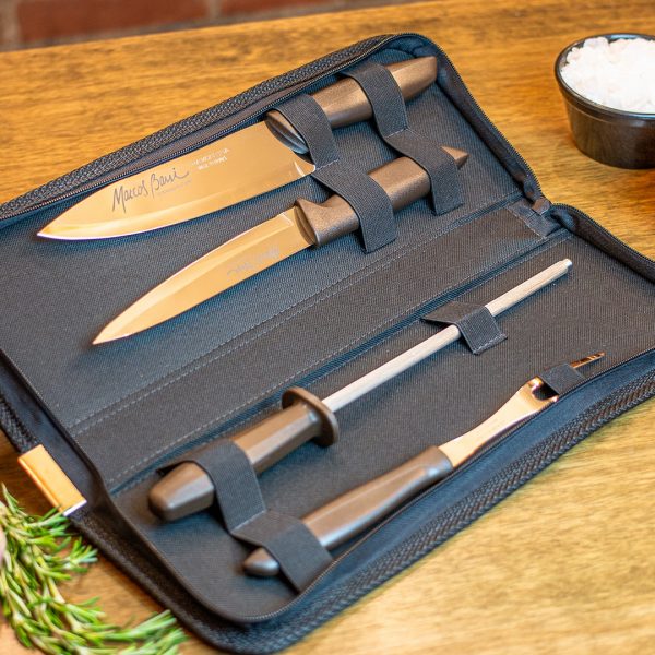 Facas e estojo com personalização da assinatura Marcos Bassi