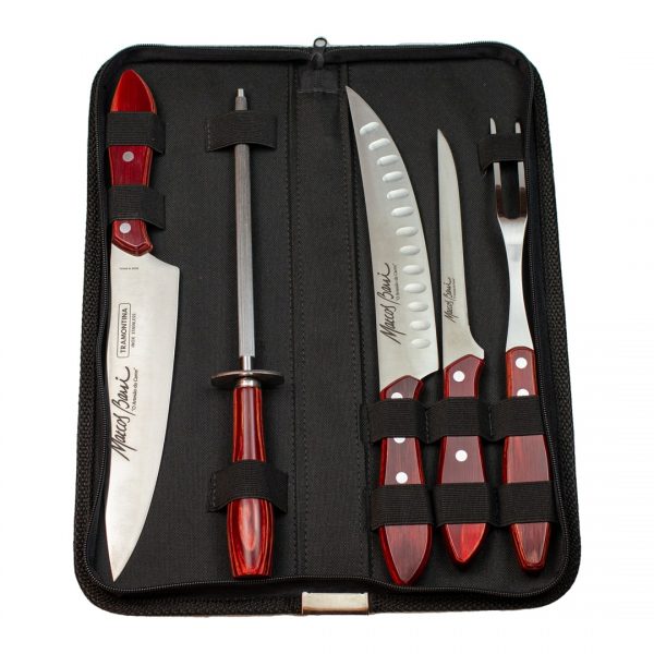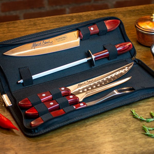 Facas e estojo com personalização da assinatura Marcos Bassi