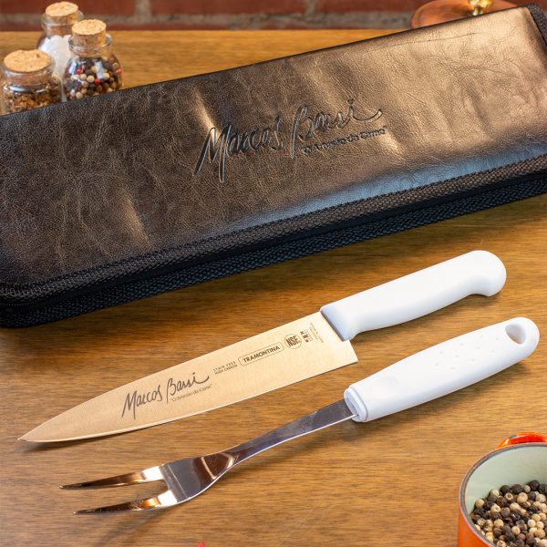 Facas e estojo com personalização da assinatura Marcos Bassi