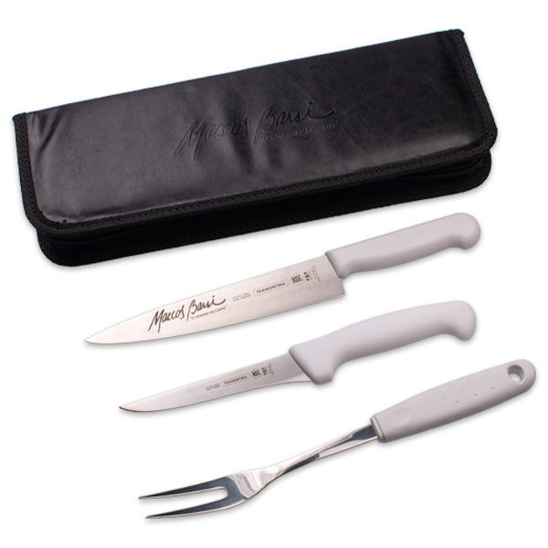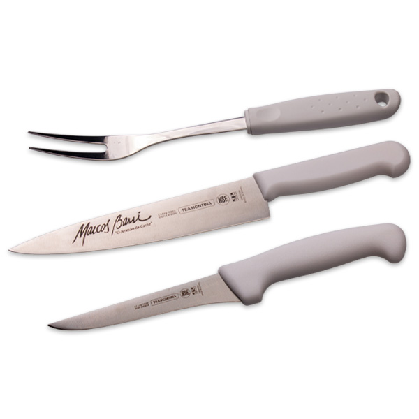 Conjunto Profissional para churrasco 3 peças em aço inox, cabo em polipropileno na cor branca e estojo sintético.
