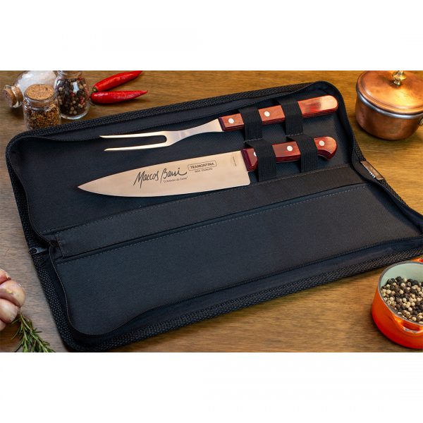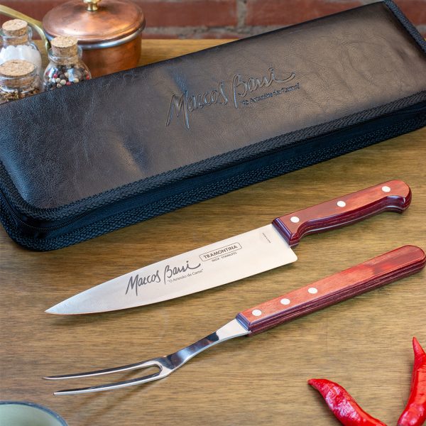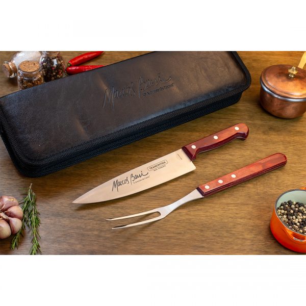 Facas e estojo com personalização da assinatura Marcos Bassi