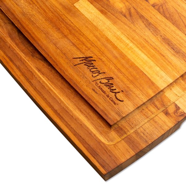 Tábua de churrasco em madeira teca com canaleta para reter o sulco.